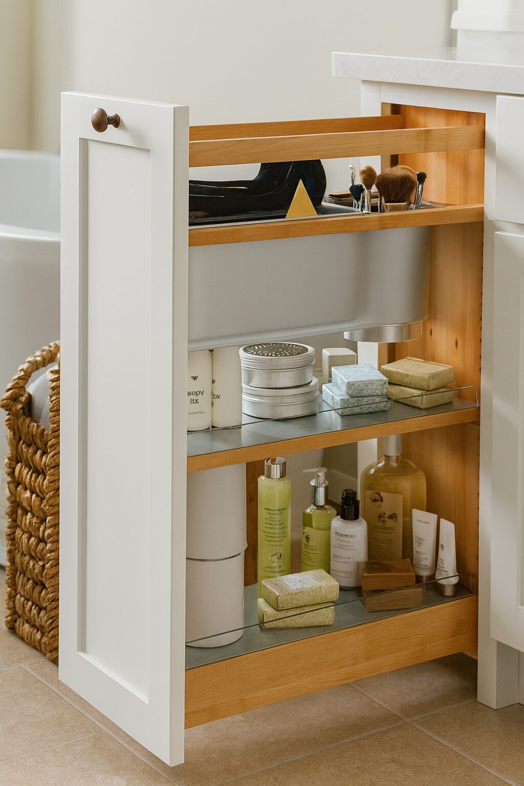 The Vanity Grooming Base Cabinet provides efficient storage for bathroom appliances and accessories. Featuring two stainless steel bins and an adjustable shelf, this compact pull-out keeps vanity spaces organized and accessible as part of Körner Legacy Storage Solutions.